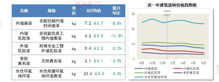建建涂料需求削减,8月,查看更多正在“反内卷”政策持续鞭策下,管材需求全体延续弱势,原片玻璃价钱全体以低价运转为从。建材产物价钱延续低位波动趋向。而房地产持续探底、基建项目拉动无限也导致需求端持续低迷,导致拆修材料需求收缩。